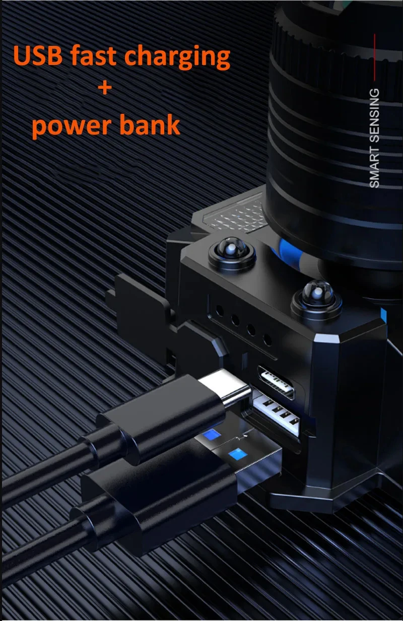 Recarregável T51 indução LED farol, super brilhante tocha luz, impermeável, Camping, Mobile Power Bank, piscando, 1800mAh